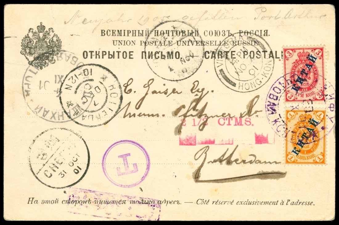 1901 (10/30) Picture Post Card Russian Office Chefoo to Netherlands, Shanghai, Hong Kong transit, Paquebot cancellation, Postage due "T","2½ CTMS" .