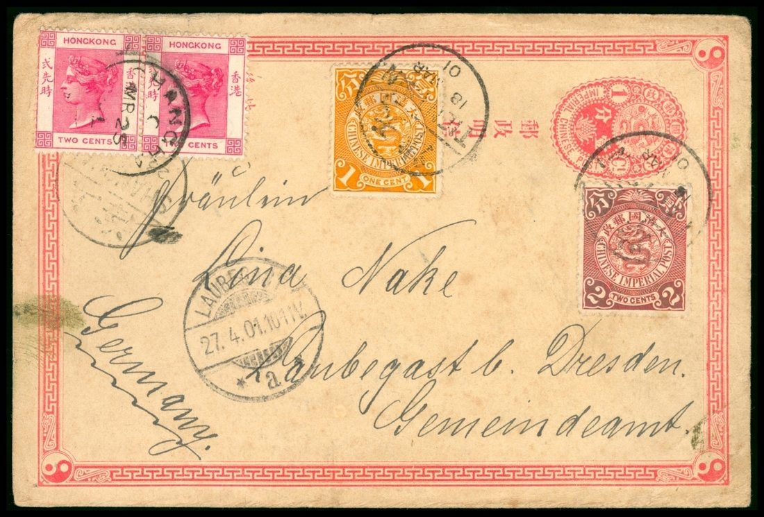 1901 (18 MAR) 1c. added C.I.P. 1c. and 2c. 1901 (18 MAR) 1c. added C.I.P. 1c. and 2c. tied by Tientsin to Germany, in combination Hong Kong Q.V. 2c. horizontal pair, cancelled by Shanghai (25 MAR) c.d.s..