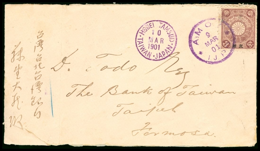 1901 (3/9) Amoy to Taipeh, 3c. Japanese Office, "HOBEI TAMSUI, TAIWAN Japan" (3/10) purple ink. One more arriving Taipeh c.d.s. on the back.