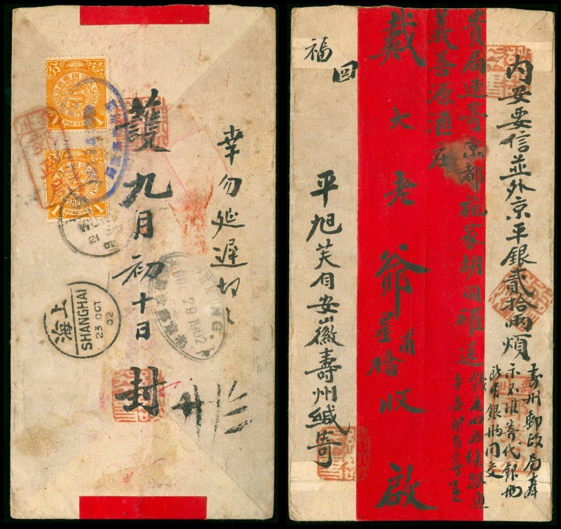 1902 Red band envelope Anhui to Peking, coiling dragon 1c. (2) tied with red Shouchow tombstone cancellation, blue Luchowfu oval cancellation (10/14), Shanghai (11/23) transit, Peking oval cancellation (10/29) on arriving.