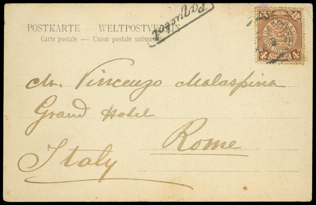 1903 (10/11) Picture Post Card Shanghai to Italy. 4c. coiling dragon tied Hong Kong Victoria c.d.s. alongside a boxed "PAQUEBOT" cancellation.