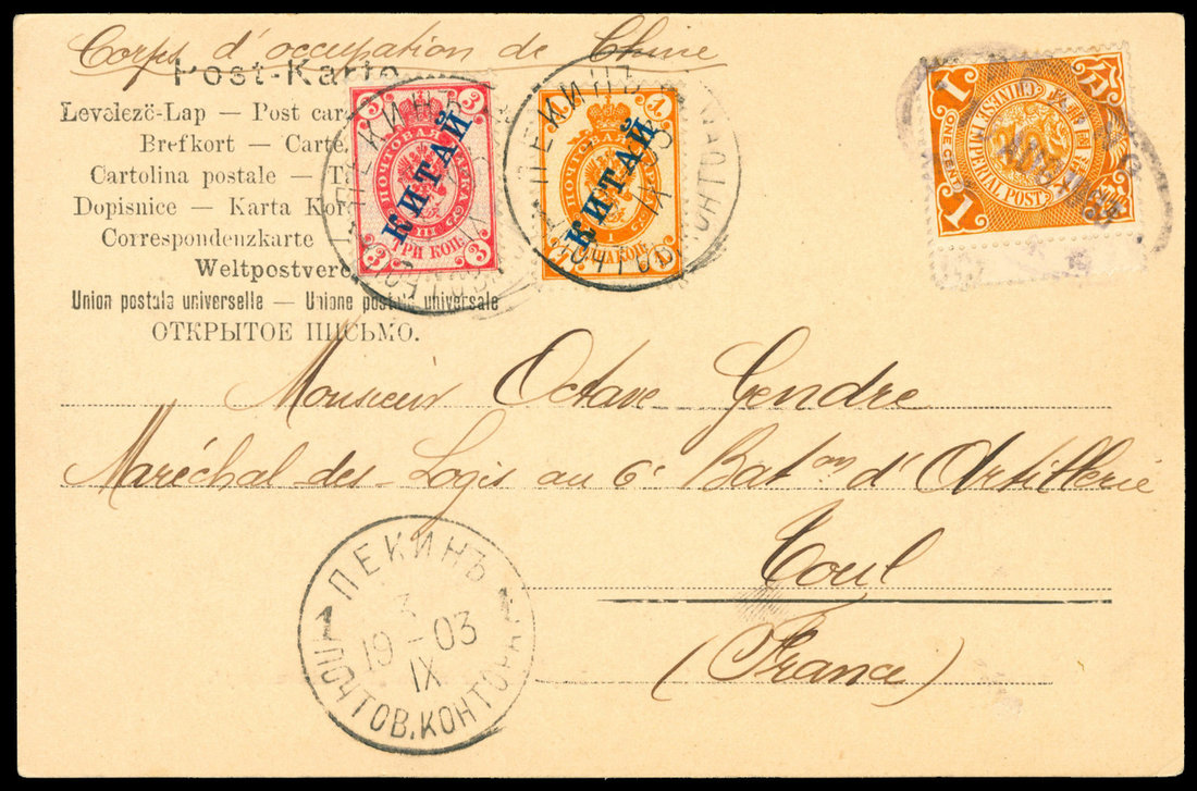 1903 (8,11) Combination Picture Post Card Peking to France. 1c. Coiling dragon tied Peking oval, Russian Office 1k, 3c. overprints along side with Russian Office Peking c.d.s.