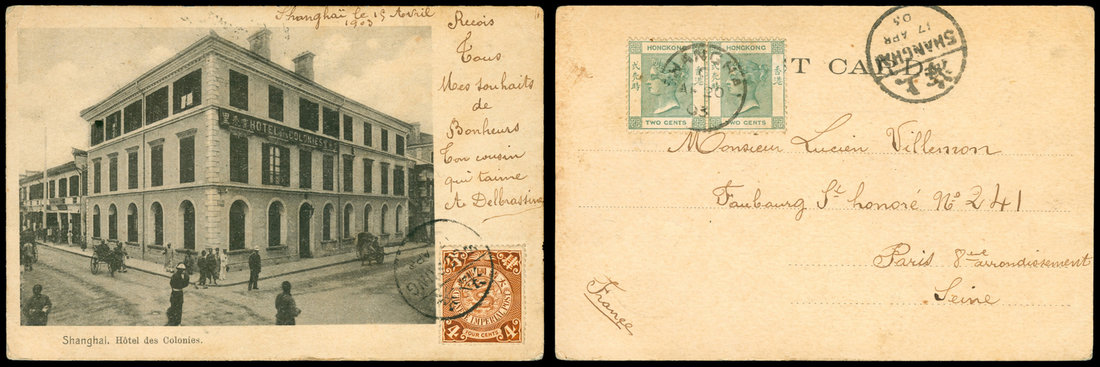 1903(4,17) view card, Woosung to France, combination usage of Hong Kong QV 2c(2) and Coiling dragon 4c.