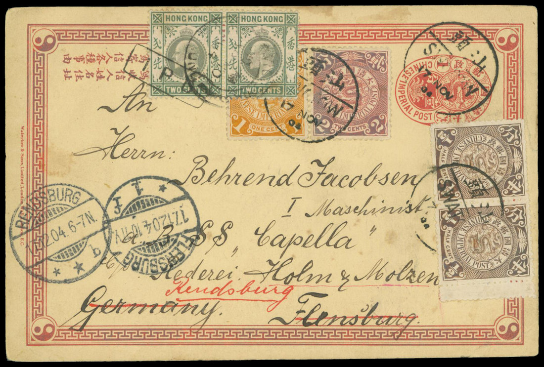 1904 (11/17) 2nd picture stationery card Swatow to Germany, ½c. (2), 1c., 2c. coiling dragon, Hong Kong K.E.D. 2c. (2) tied with an IPO chop and Hong Kong c.d.s.