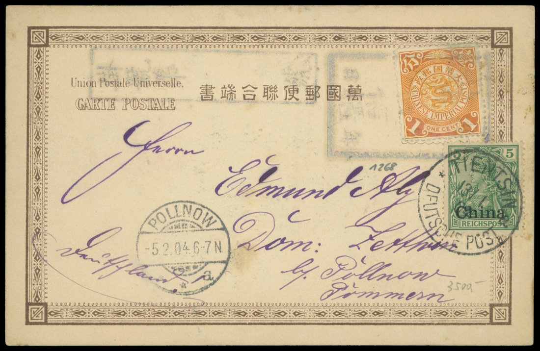 1904 Picture Post Card combination used Tientsin to Germany, 1c. coiling dragon tied with an unclear tombstone cancellation.