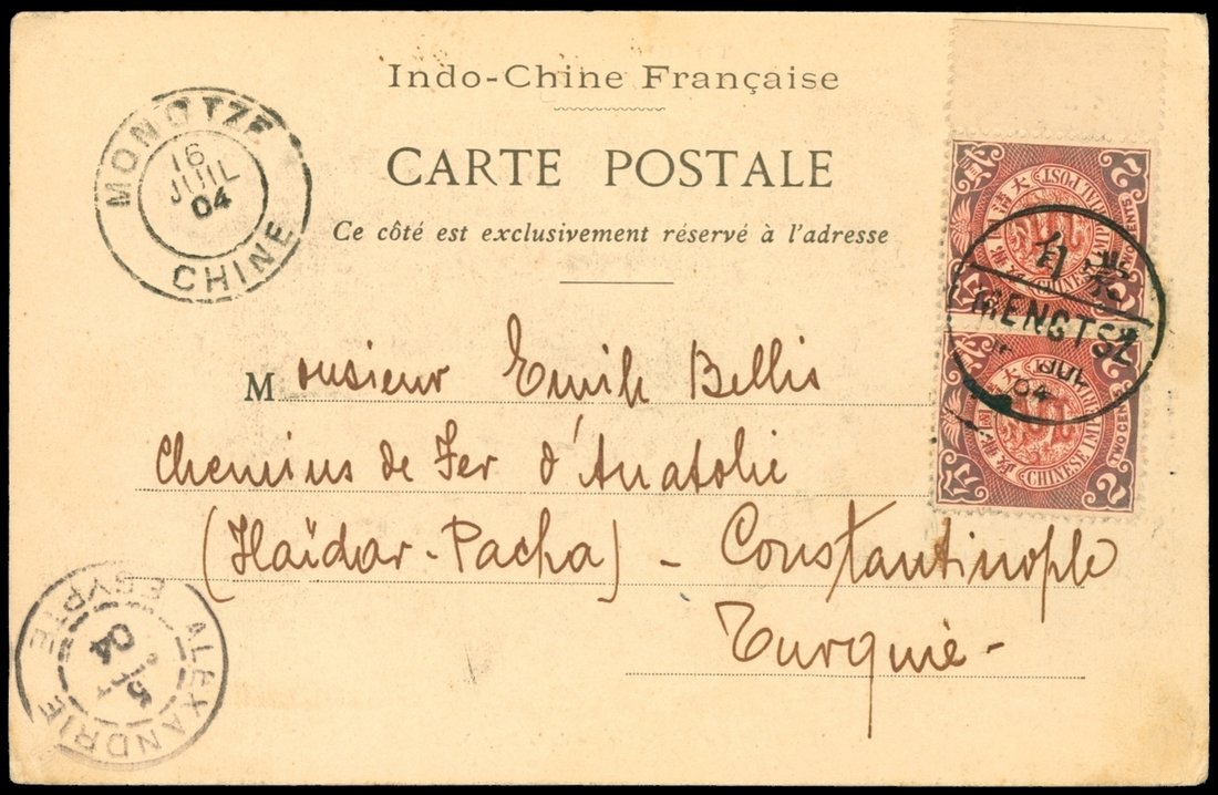 1904 Picture Post Card Mengtze, Yunnan to Turkey, 2c. (2) coiling dragon tied with Mengtze bilingual c.d.s.