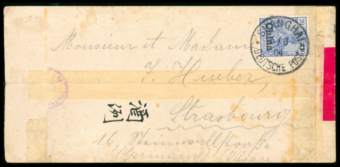 1904 Red band envelope Hankow privately delivered to Tanshan Coal Mine, Huangshigang, further forwarded to Germany, franked additional German Office 20c. tied Shanghai c.d.s.