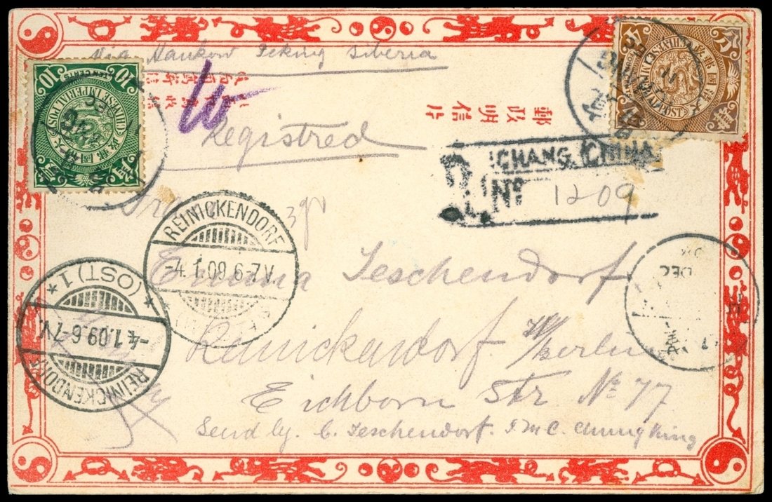 1908 Picture Post Card registered Ichang to Germany, 4c., 10c. coiling dragon, Hankow transit. A fine Ichang registered chop.