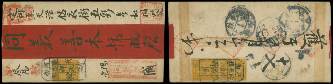1910 red band envelope Honan to Tientsin, 1c. (3) coiling dragon tied with small town postal agency tombstone cancels.