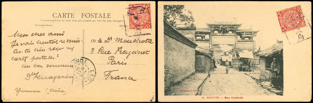 1908 Yunnan Picture Post Card to France, coiling dragon 2c. (2) tied with Chongpeiho tombstone cancellation, Laokey transit (5/6).