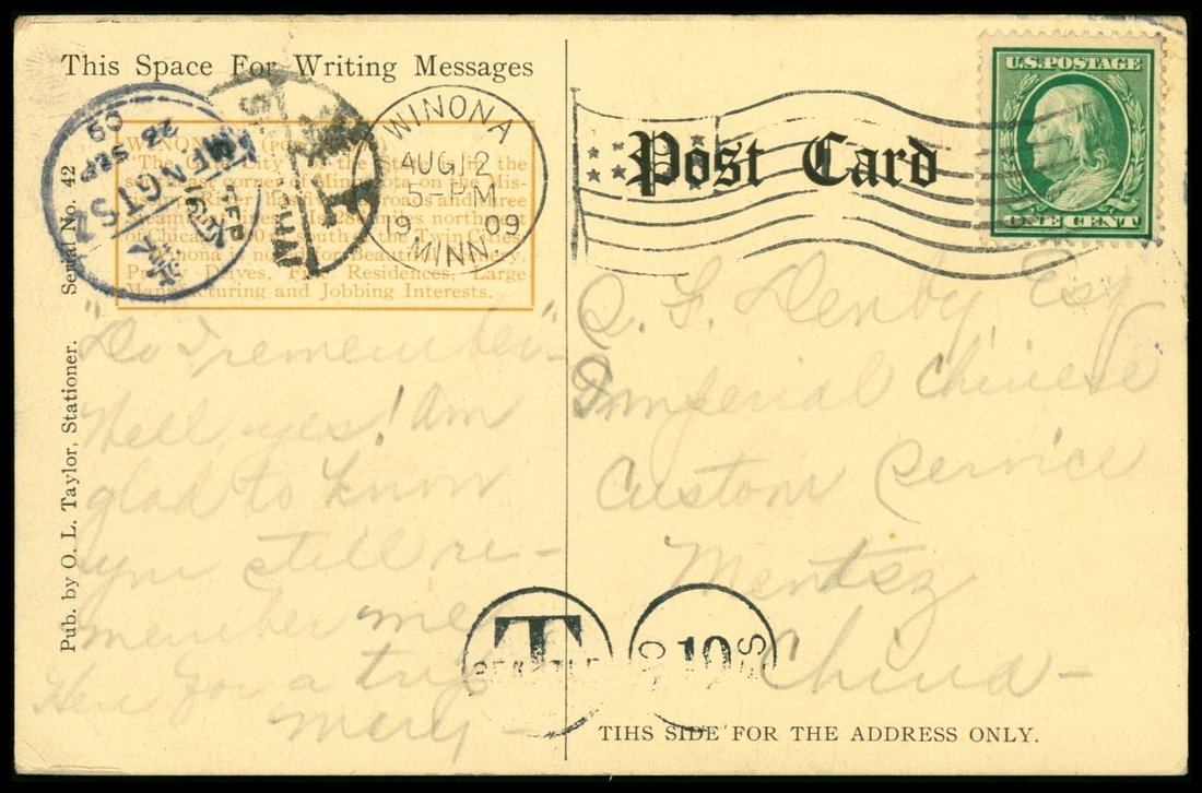 1909 (8/12) U.S.A. incoming Picture Post Card to Mengtze, Yunnan (9/22 bilingual c.d.s.), U.S.A. postage due marking.