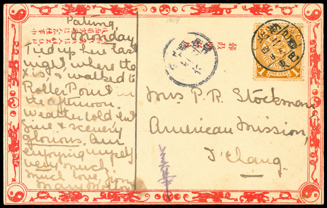 1909 Picture Post Card (Three Gorge view) Hupeh to Ichang. 1c. coiling dragon tied with Badong, Hupeh lunar c.d.s. (2/4), Ichang arriving (2/6).