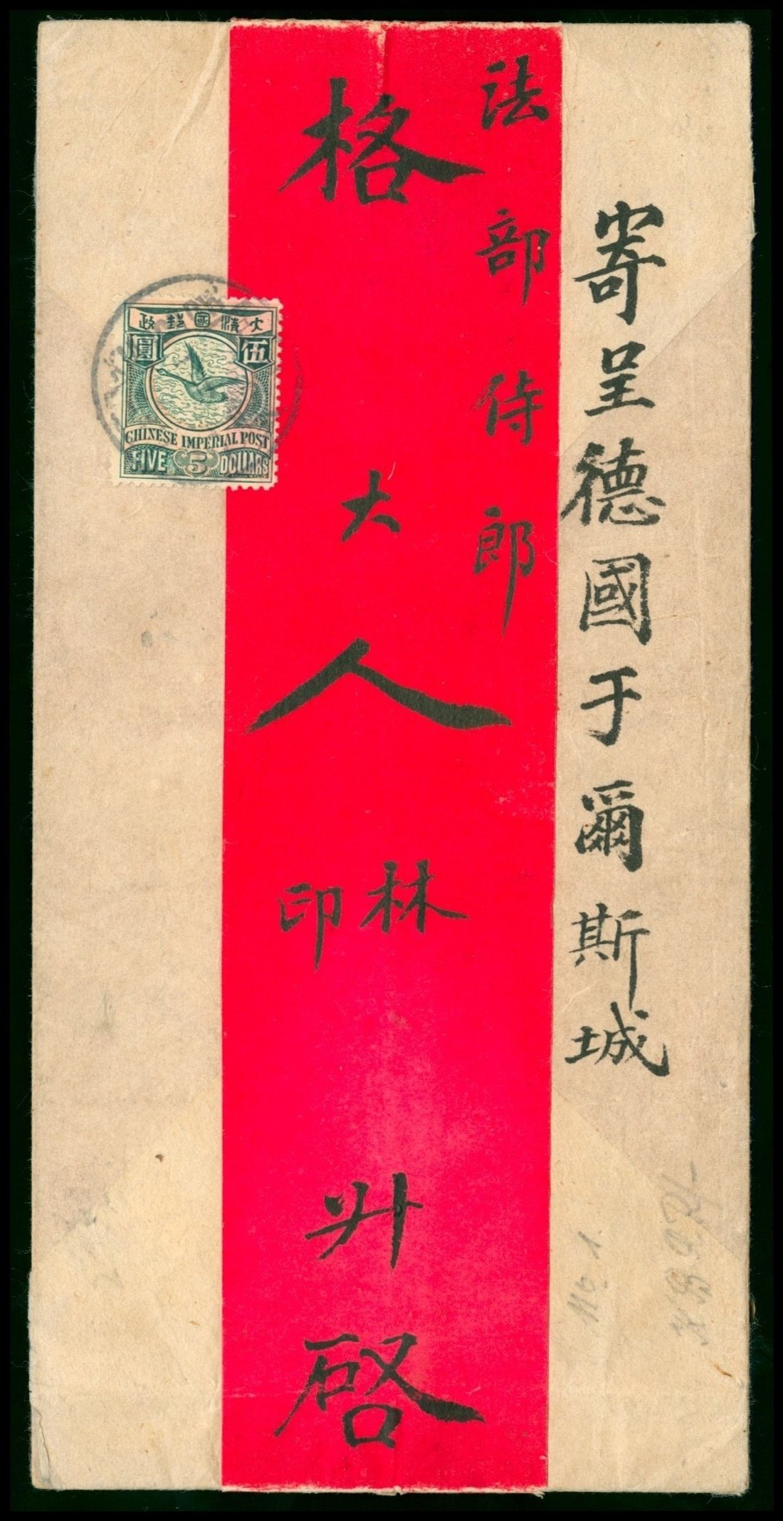 1909 red band cover bearing flying wild goose $5 unwatermark, tied by Kiaochow Lunar c.d.s.