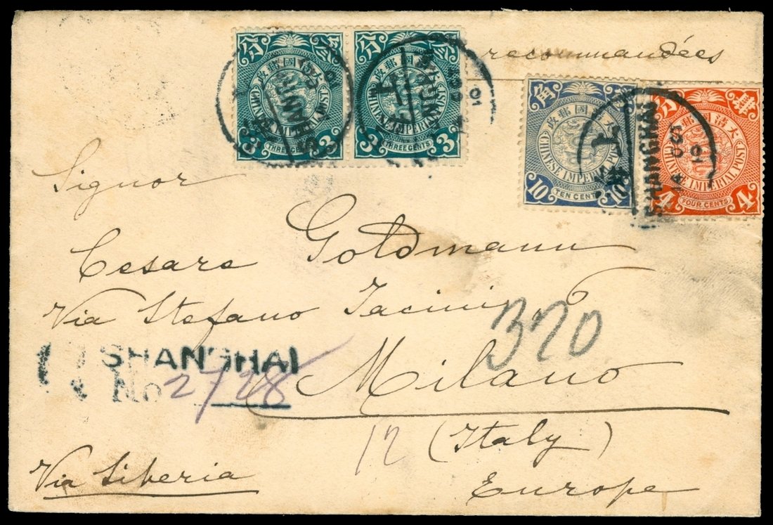 1910 (10/14) registered Shanghai to Italy, Via Siberia, franked with coiling dragon 3c. (2), 4c., 10c. Back Italian arriving c.d.s. (10/31).