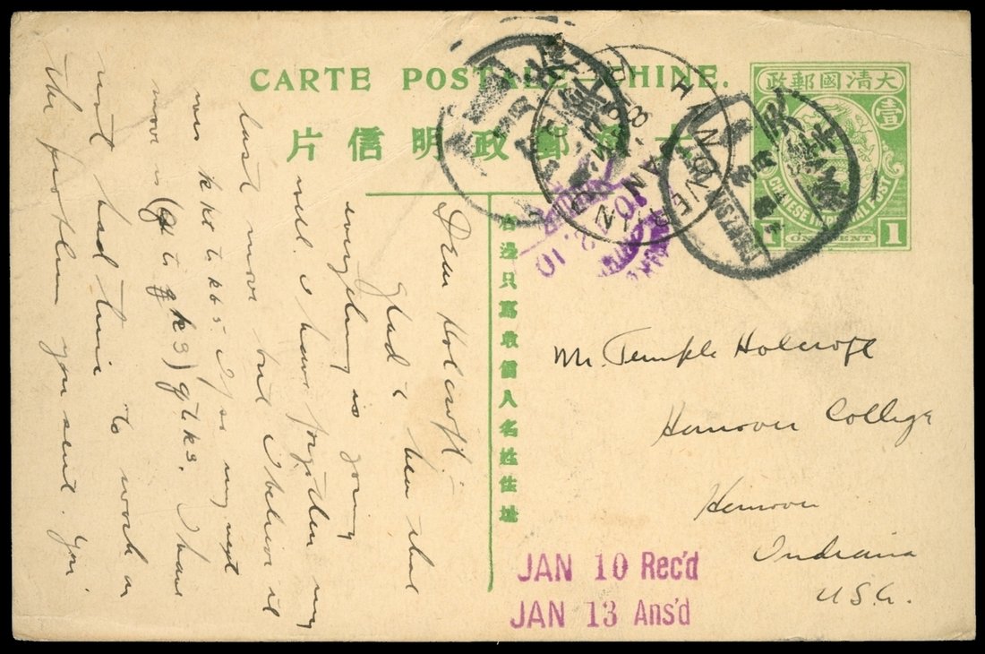 1910 4th 1c. picture stationery card Tientsin to U.S.A., no postage due applied, Nagasaki transit and one arriving c.d.s.