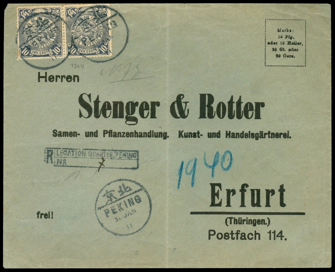 1911 (1/3) Peking registered cover to Germany, "Legation Quart Peking" registered marking. 10c. (2) coiling dragon. German arriving c.d.s. (2/11).
