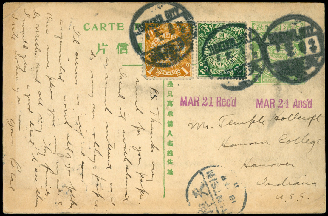 1911 (2/18) 4th 1c. picture stationery card Tientsin to U.S.A., uprated 1c, 2c. coiling dragon
