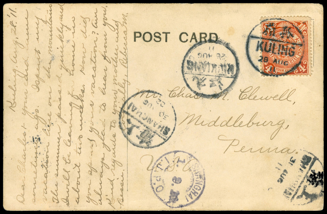 1911(8,28) View card to USA. 4c tied Kuling cds, via Kiukiang, Shanghai.