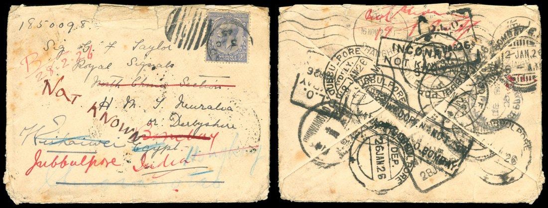 1925 (10/3) U.K. incoming cover to British North China Navy fleet. Shanghai (11/2), Tsinghwatau (11/22), forwarded to Egypt, then India in 1926, more than ten years later, "DLO Bombay" boxed cancel.