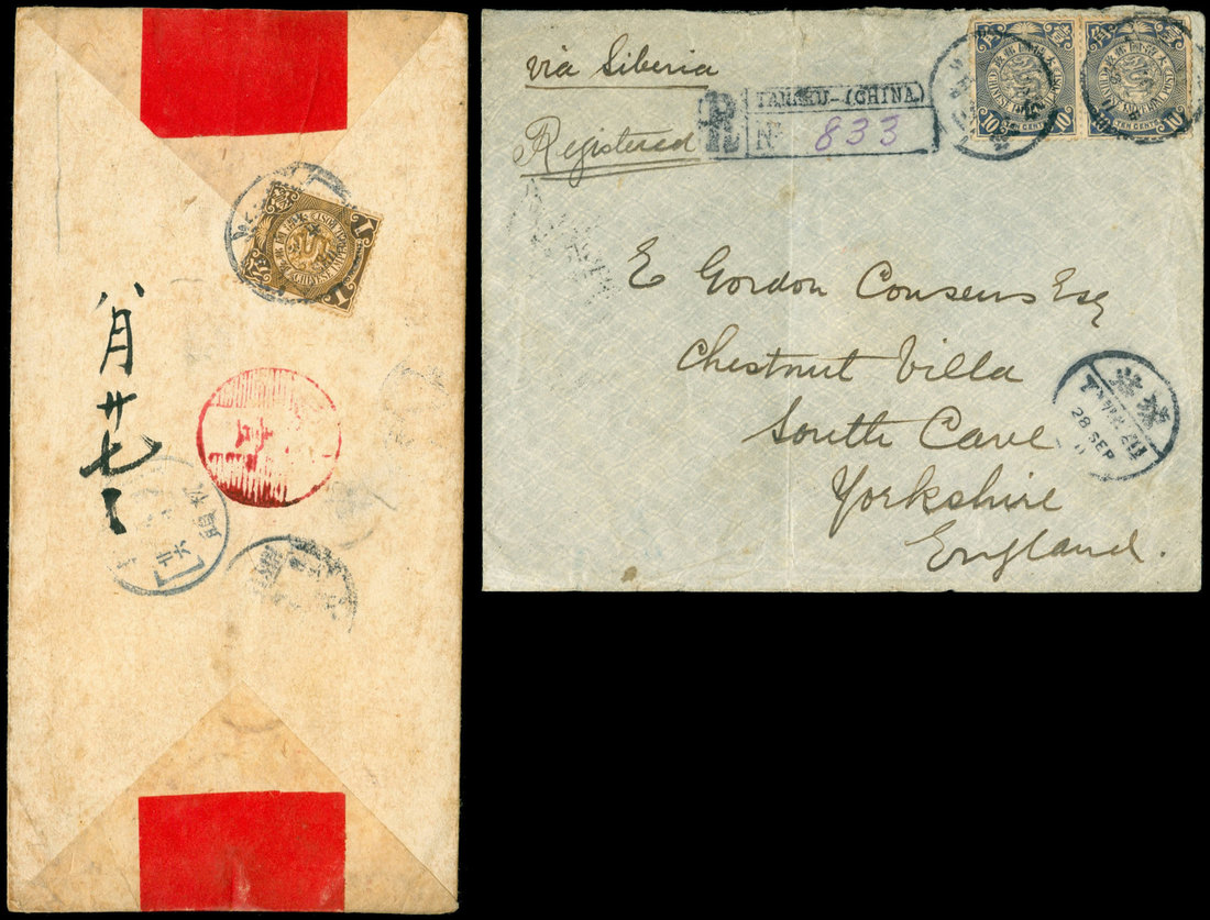 Registered Mail: A groups of covers which includes red band cover bearing, on the reverse, circular numbered dater "1" with horizontal lines, struck in red; Red band envelope from Yangtsun bearing double framed registration handstamp; Chungking (2 adhesives missing) and Tangku with boxed registered handstamps, Hankow with vertical boxed registered handstamp in red. Condition is a little mixed. (6 covers)
