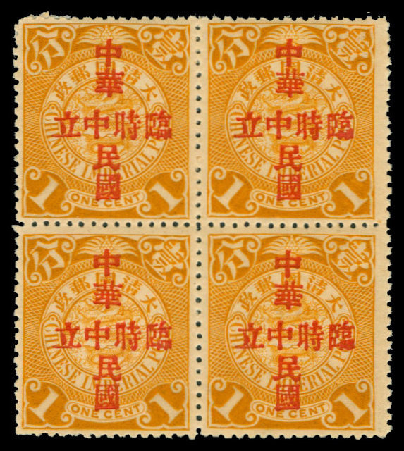 1912 Coiling Dragon opt. 'Republic of China, provisional Neutrality' 1c. block of four, mint original gum, very fresh and fine. Chan 144.