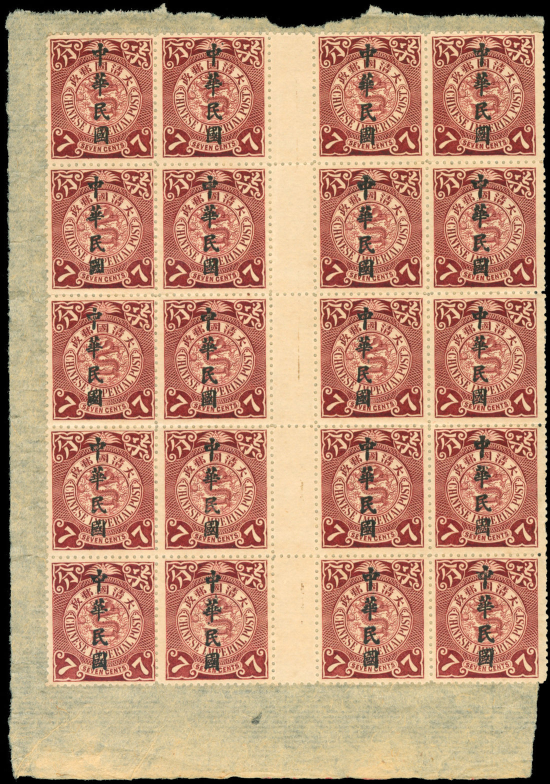 1912 coiling dragon, Waterlow and Sons, opt. "Republic of China" 7c. Crimson, gutter block of twenty, mint stuck on white paper. Chan 175