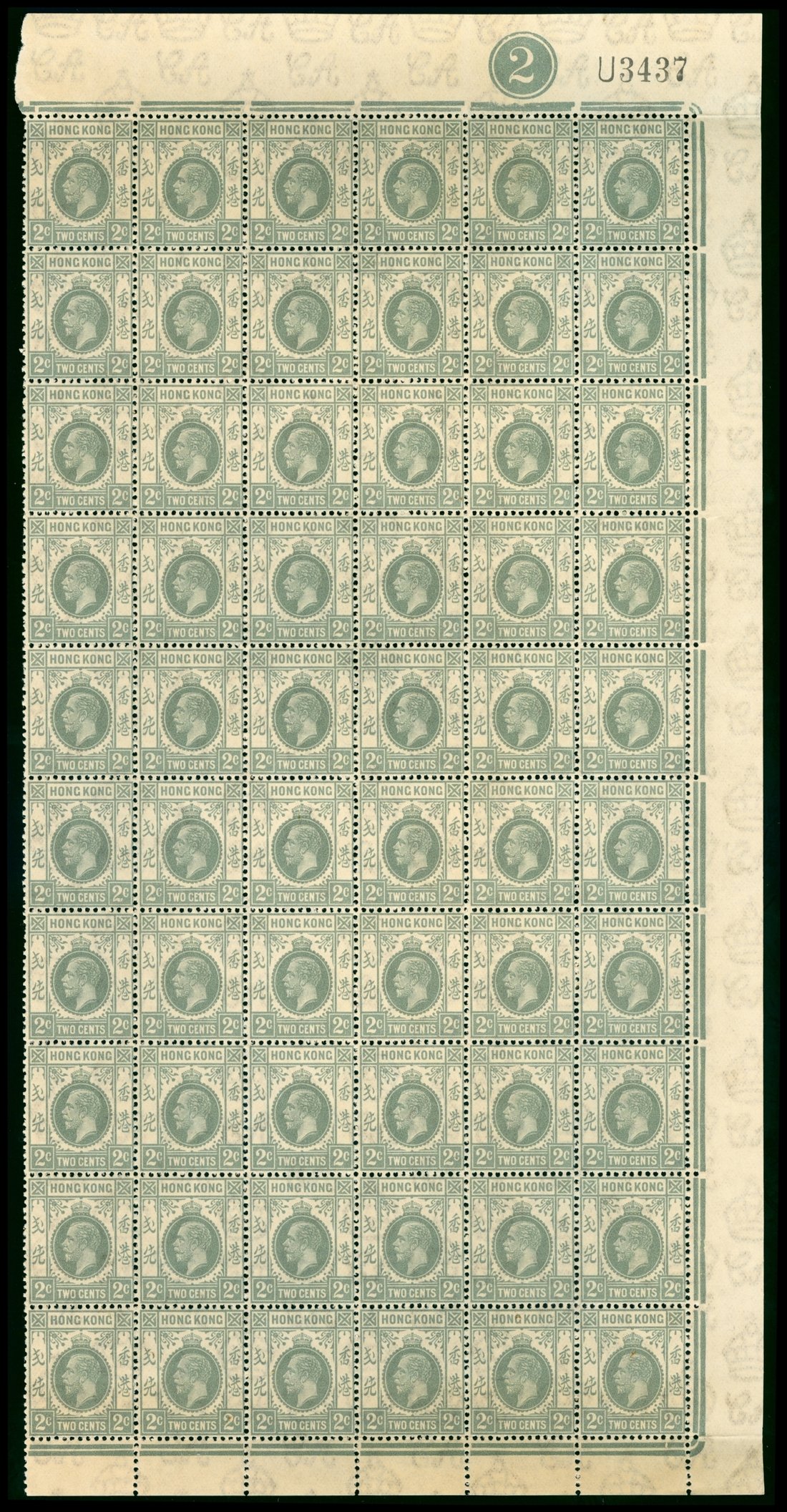 1921-37 K.G.V. 2c. Gray, pane of sixty with sheet no. U3437. Unmounted mint, toned. SG118c