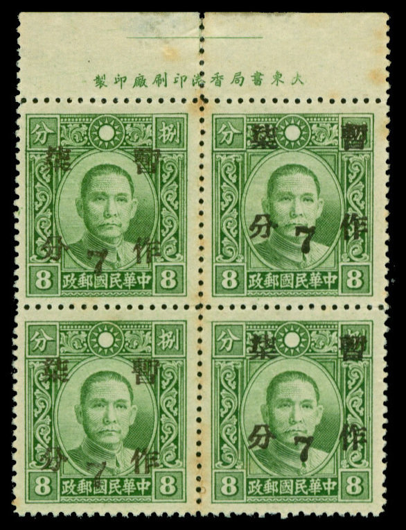 1941 surcharge of 7c., Fukien 7c. on 8c. block of four with top imprint margin, right 2 stamp surcharge shifted upward variety, mint.