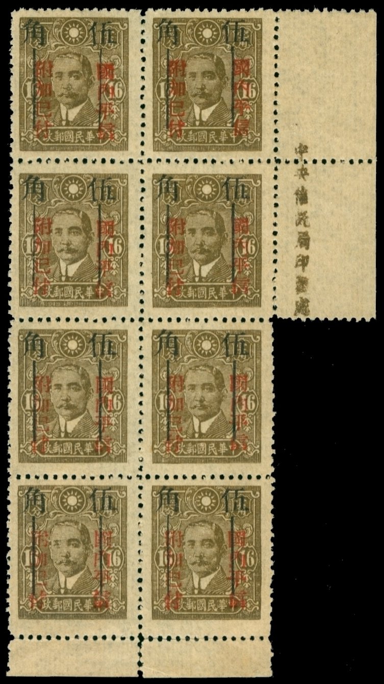 1942 Sun Yat Sen 50c./16c. E. Szechwan DPP surcharges marginal block of 8, with one thin "16".