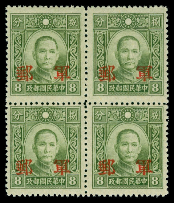 1943 Kwangsi: 8c. olive-green, perf.13½, block of four, unmounted mint. Chan M6b; CSS M11b, $400