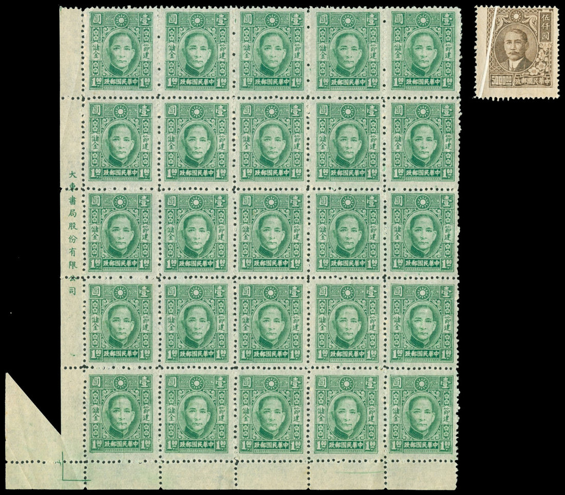 1947 Sun Yat Sen 2nd Shanghai Dah Tung Print $5,000 grey brown paper fold, variety, unused, plus Saving stamp $1 block of twenty-five, sheet margin with paper fold variety, unused. Chan 1035.