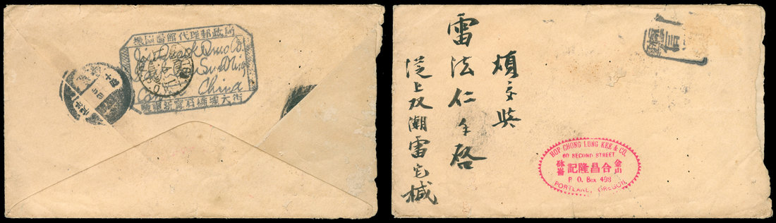 1912 Sunning, Kwangtung cover to Portland, U.S.A. rare postal agency marking back, stamp missing.
