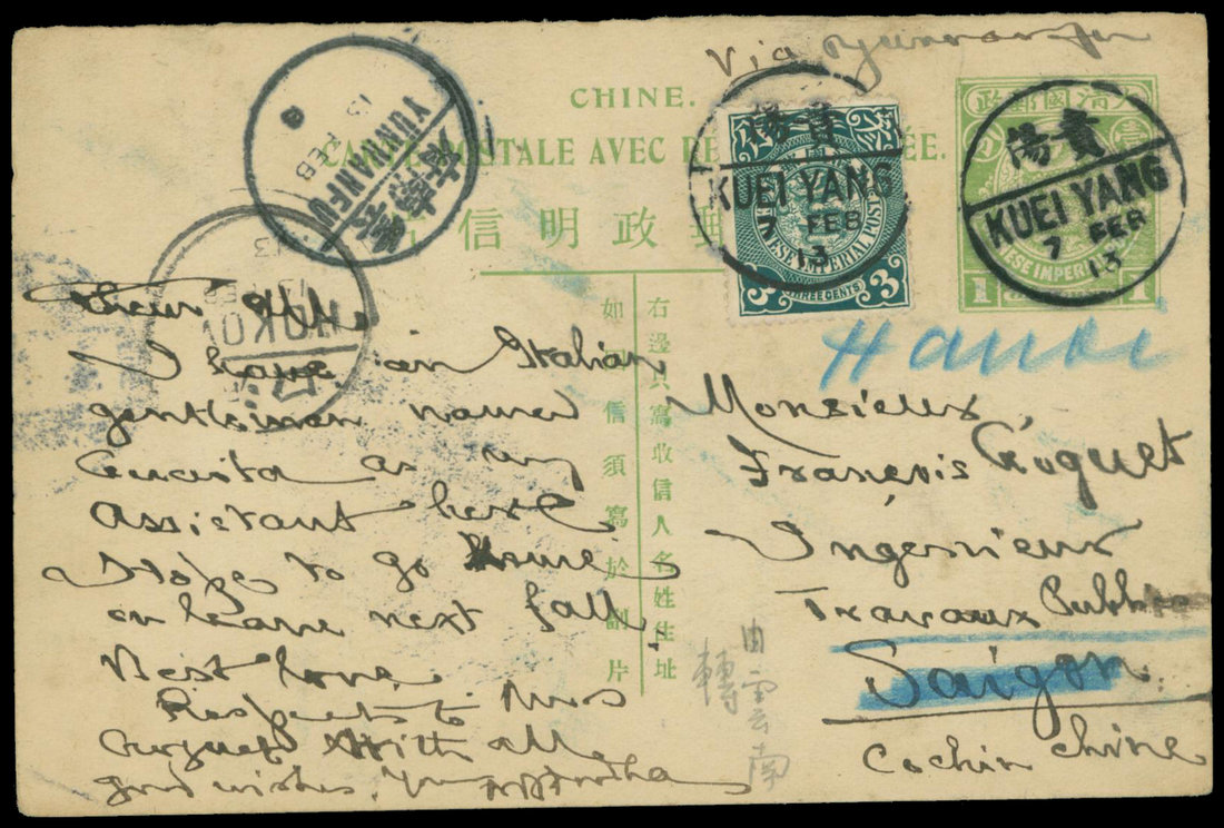 1913 (2/7) 1c. 4th picture stationery card to Indochina. Uprated 3c. coiling dragon, tied with Kueiyang bilingual c.d.s. Yunnanfu transit (2/13), Hokow (2/15).