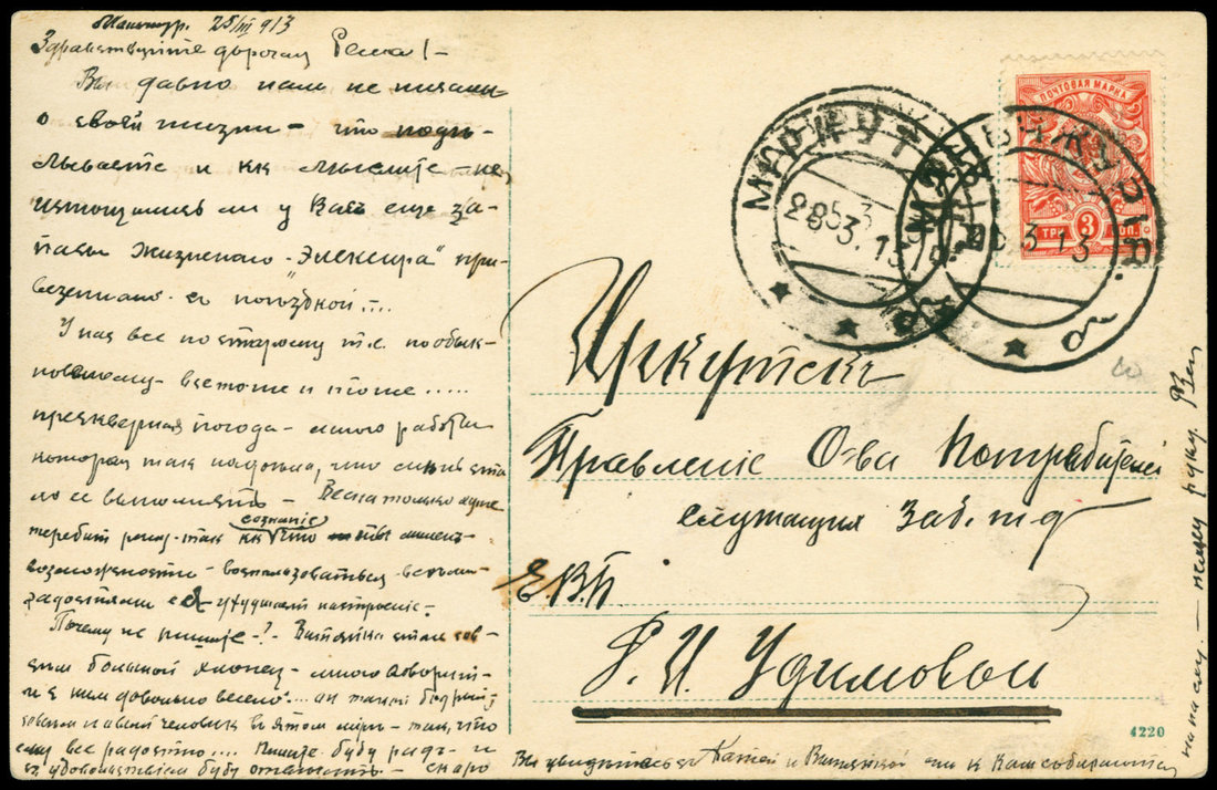 1913 (3/25) Picture Post Card Manchuli to Irksutsk. 3k. tied with Russian Office Manchuli c.d.s.