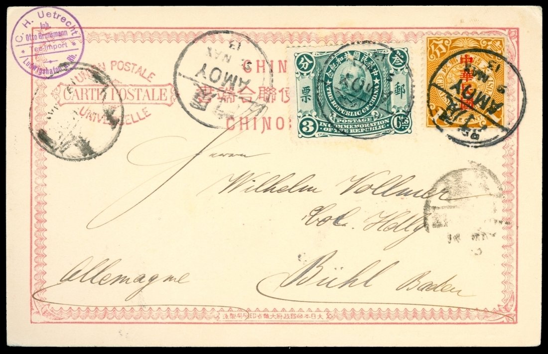 1913 (5/9) Picture Post Card Amoy to Germany via Siberia, 1c. Coiling dragon, 3c. YSK issue, Shanghai, Moukden transit c.d.s.