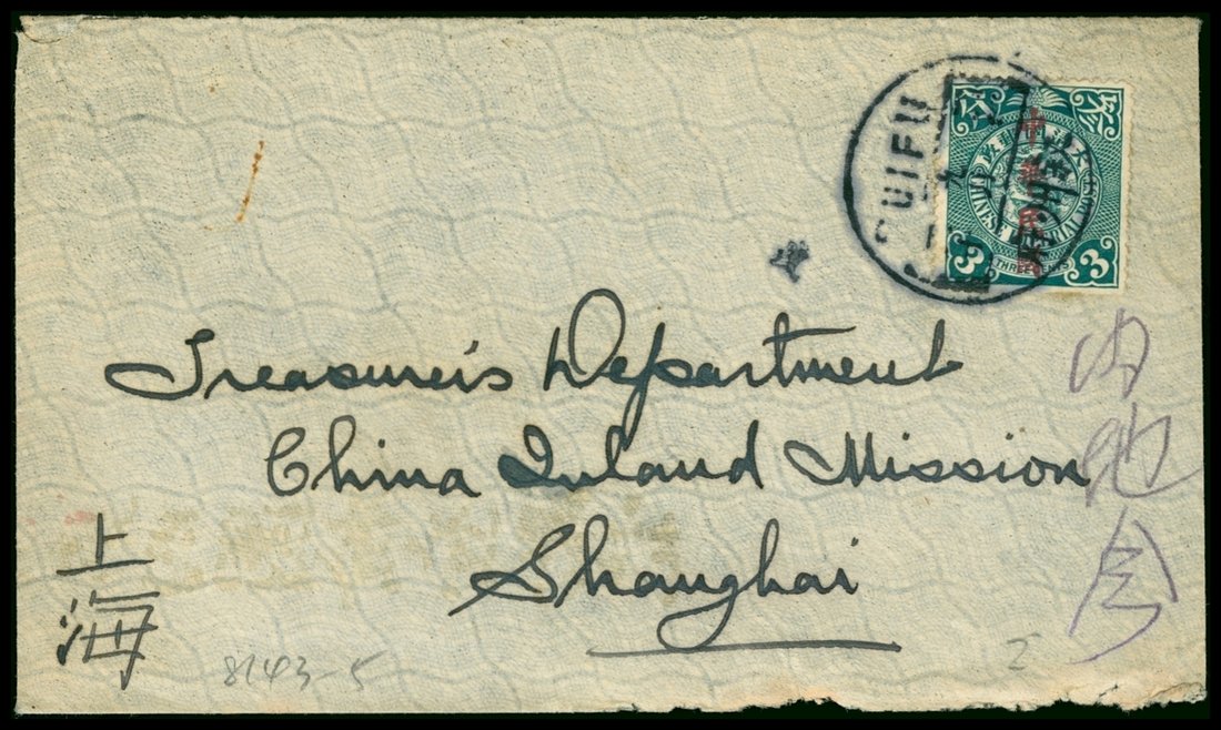1913 (9/2) Suifu, Szechwan to Shanghai, 3c. ROC overprint single franking.