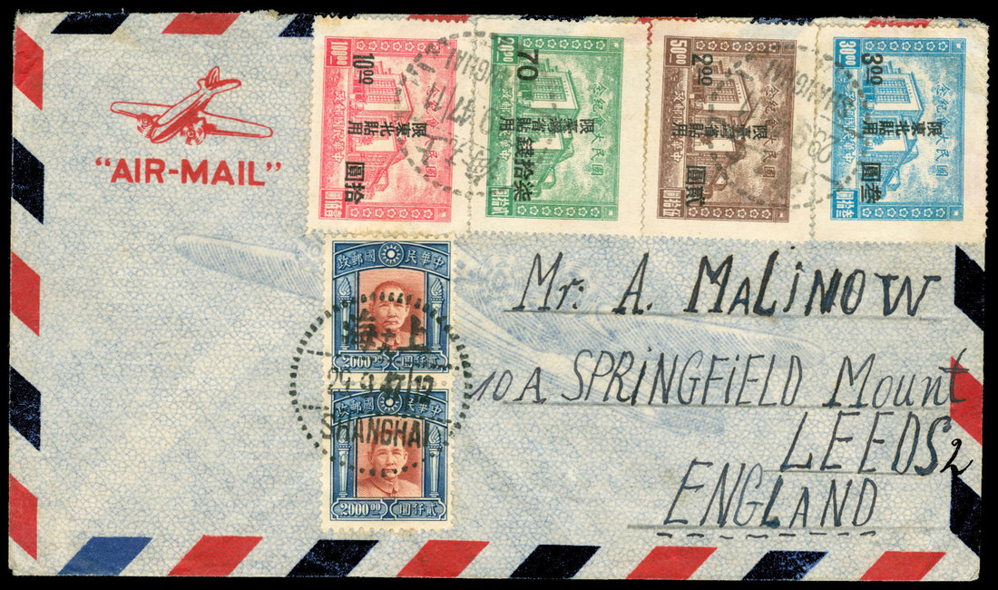 1947 (9/29) Shanghai airmail to U.K., combination usage a set of NE National Assemby and regular Chinese Nationalist Currency Sun Yat Sen $2000 (2). Unusual.