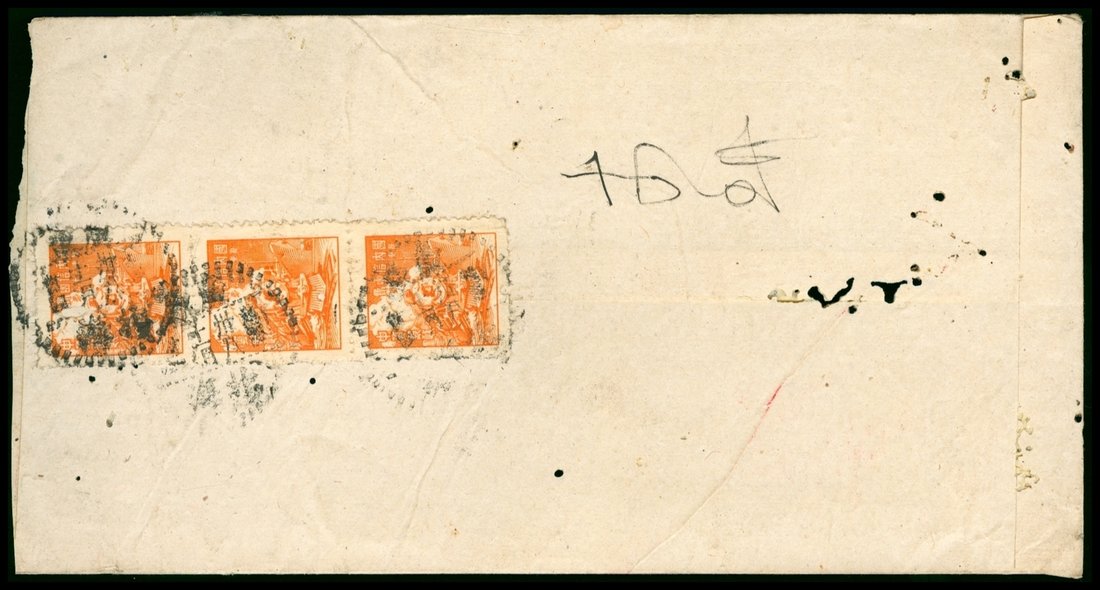 1949 (11/7) Silver Yuan airmail Pakhoi, Kwangsi to Haikou, three unit stamps, cover trimmed at top.