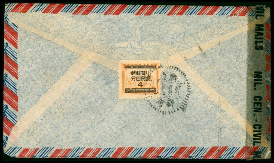 1949 (29 May) cover from Kwangtung to Japan bearing 4c. Silver Yuan revenue surcharge tied by Sunwai c.d.s. with censor seal and contents.