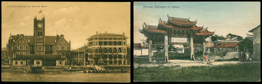 Shanghai early Picture Post Card (2), Custom house and Paoshan School views, unused.
