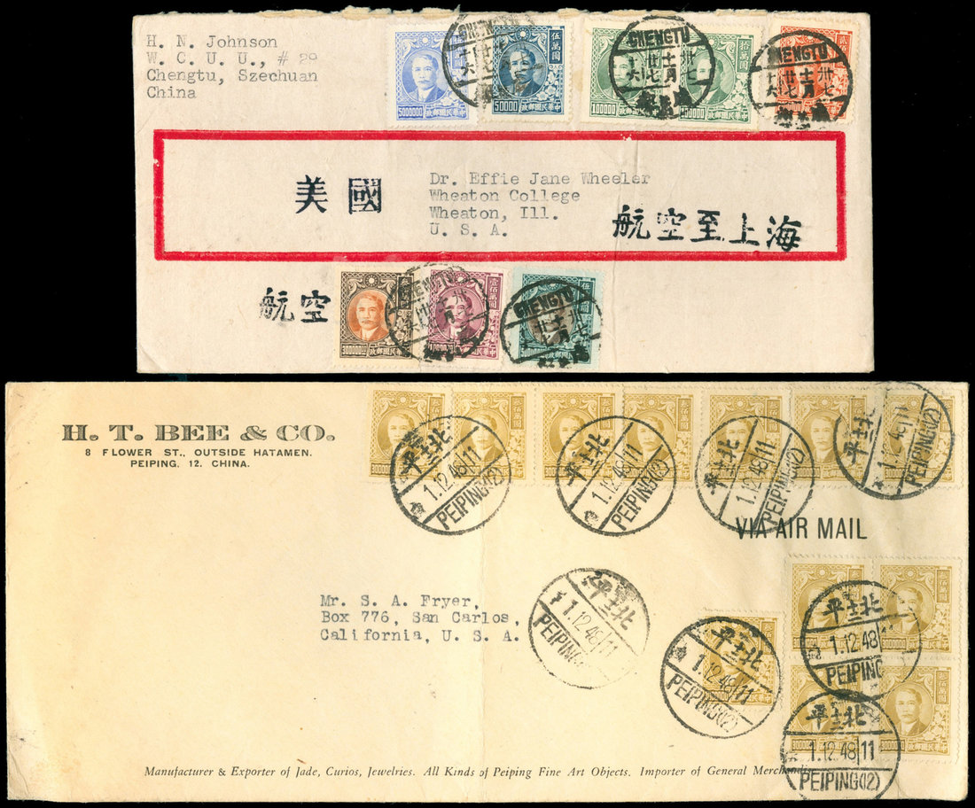 1916-48 a middle period selection of covers which includes several covers from the inflation period showing a variety of high value frankings to overseas destinations including C.N.C. with $36,000,000 franking and Gold Yuan $3,320,000 franking, some postal stationery, Japanese Occupation, Manchuria and Manchukuo, taxed cover bearing 1912 and 1913 Postage Dues together, Shui P.O. registration label and 1937 first flight cover to U.S.A. A mixed group. (50 covers)