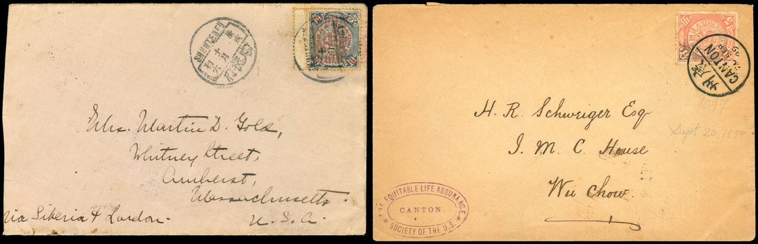 A group of covers and cards which includes a group of picture post cards, 1905 envelope to Kaising with a superb strike of the bilingual c.d.s. in blue dated (27 June), the latest recorded date, 1899 envelope from Canton to Wuchow with despatch and arrival bilingual c.d.s., Swatow I.J.P.O. and Shantehfu numbered dater in red. Typically mixed condition. (22 covers)