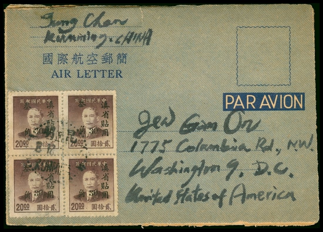 Yunnan Province: 1949 (8 Dec.) Air Letter to Washington, U.S.A. bearing 30c. on $20 block of four cancelled by a central strike of Kunming c.d.s. with a further strike on the reverse