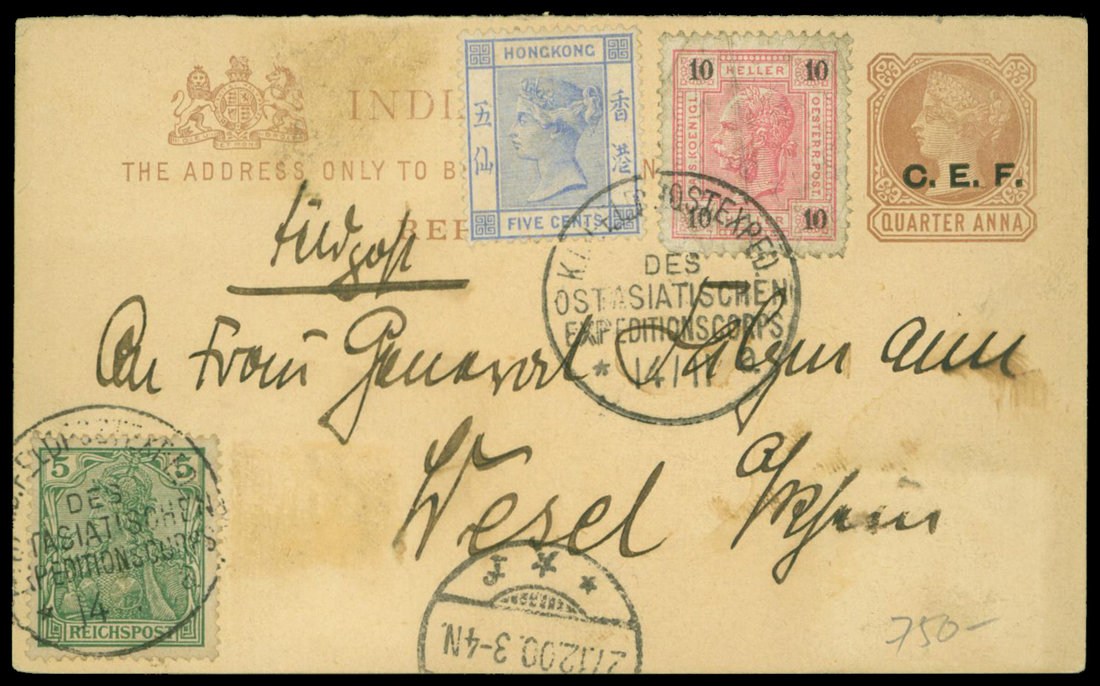 1900 CEF card combination usage, with Hong Kong Q.V. 5c., plus German and Austrian stamps, German Expedition Military tied on stamps.