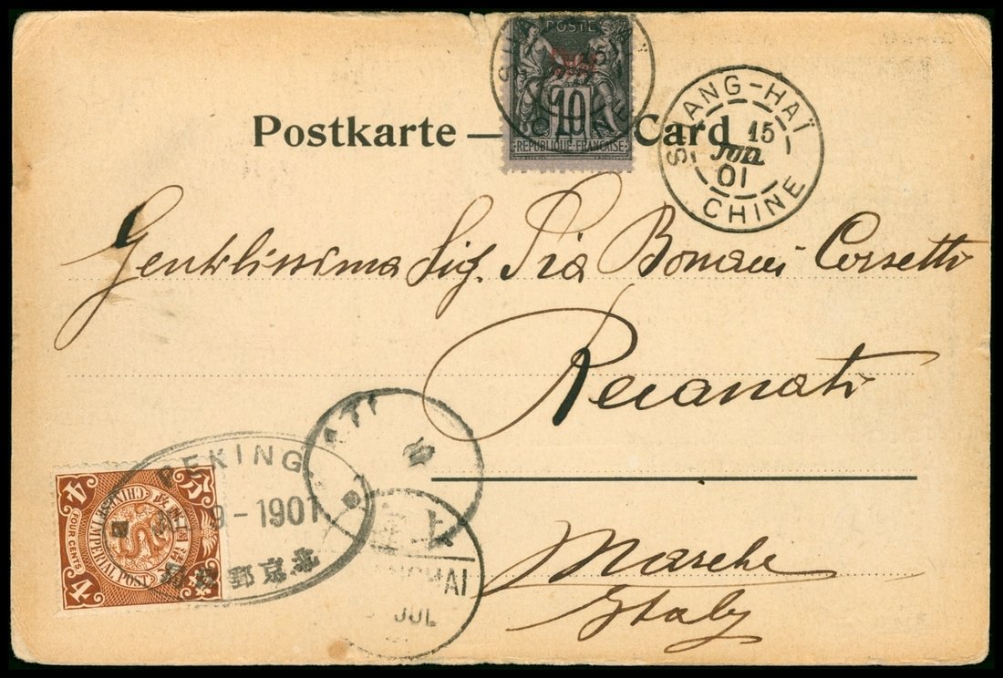 Peking: 1901 (9 July) picture post card of the Italian Bersaglieri to Italy bearing C.I.P. 4c. tied by Peking dated oval with French Chine 10c. (defective) tied by "shang-hai/chine" c.d.s. with Shanghai bilingual and Reianati arrival c.d.s.; light soiling