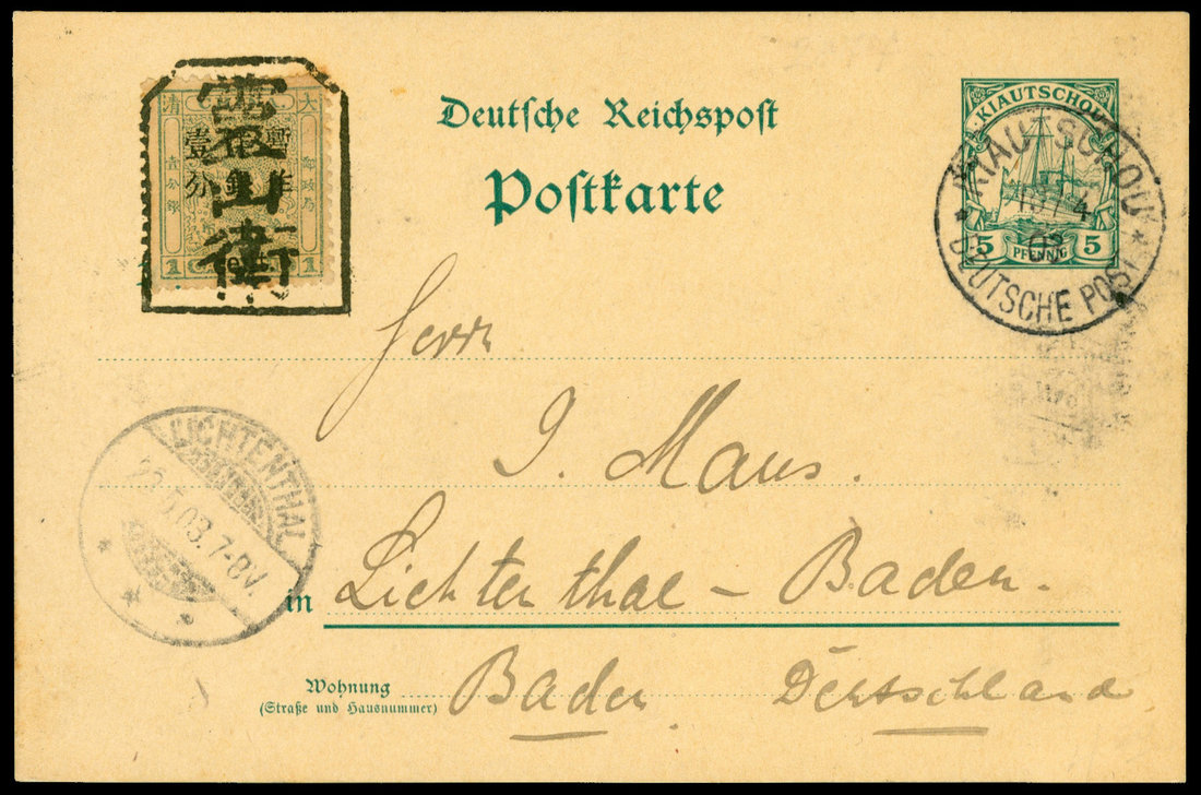 1903 Kiaochao 5c. picture stationery card to Germany, small dragon 1c. tied with Lingshanwei tombstone cancellation.