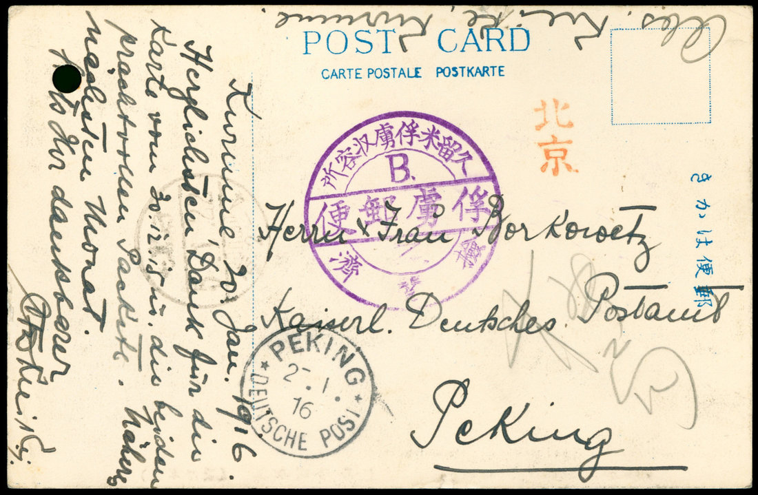 1916 (1/27) Japan WWI Kurume POW Camp Picture Post Card to Peking, German Post Office Peking c.d.s. on arriving. Filling hole on the corner.