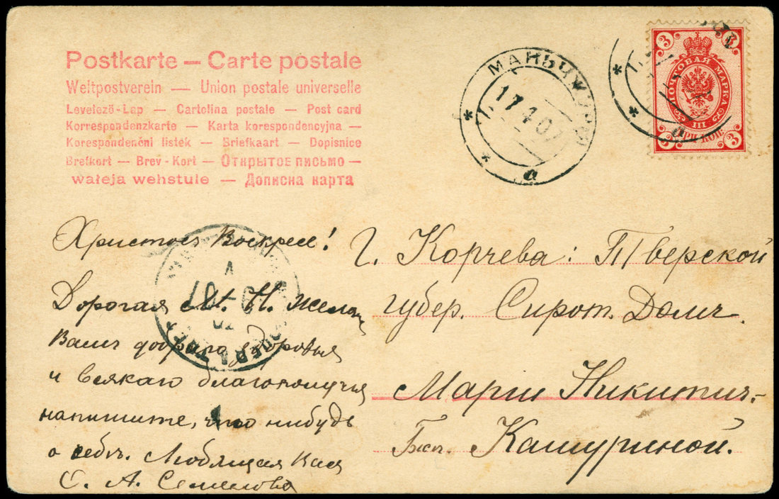 1907 (4/17) Picture Post Card to Russia, 4k. tied with Small double ring Russian Manchuli c.d.s.