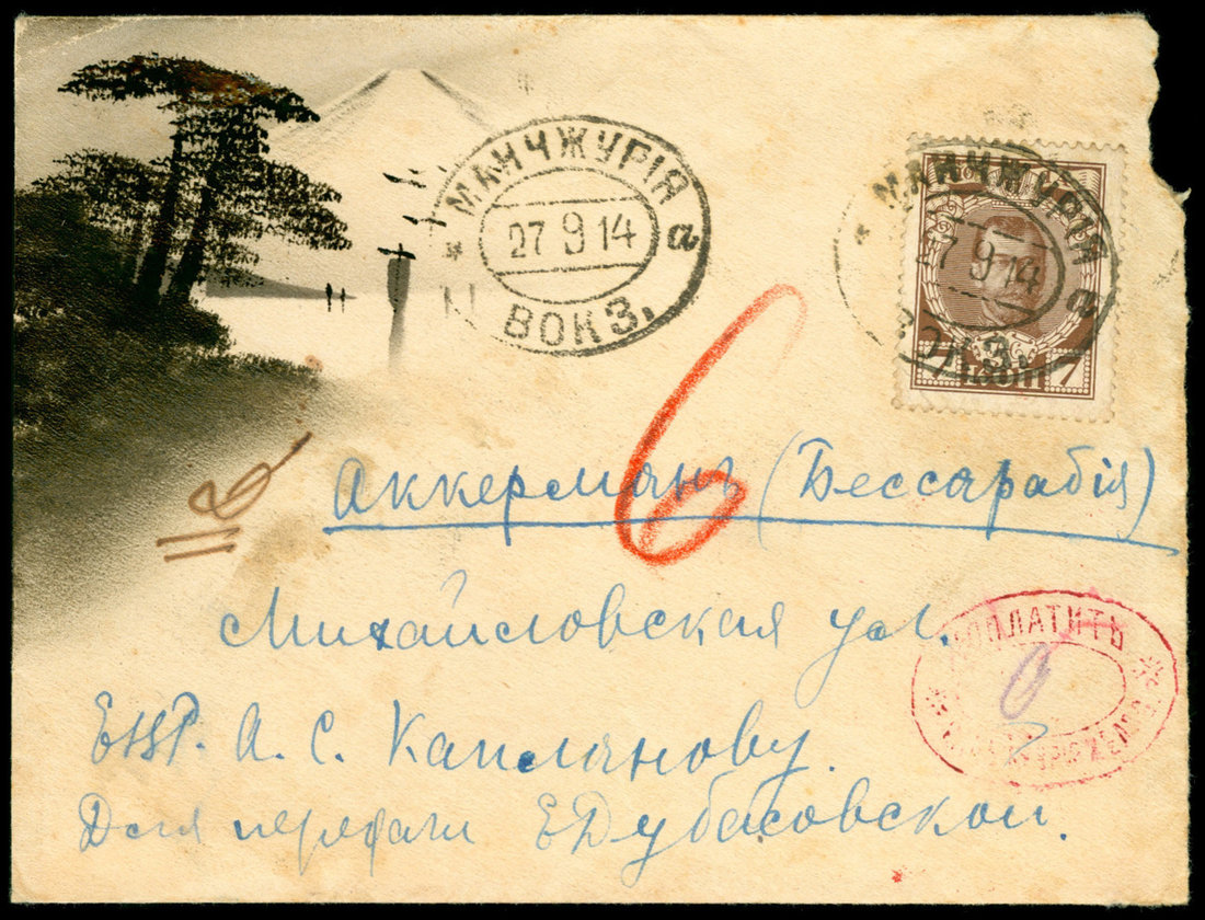 1914 (9/27) Russian Office Eastern Railway to Ukraine, 7k. tied with Manchuli c.d.s., postage due marking in red with hand written "6" due.