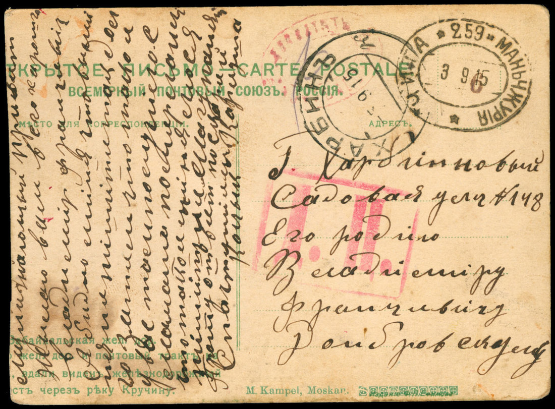 1915 (9/3) Picture Post Card Chita, Russia censored to Harbin, Chita-Manchuli Railway 259 oval cancellation, one oval postage due marking in red, some soiling.